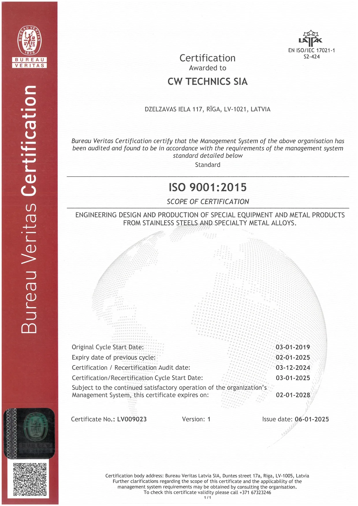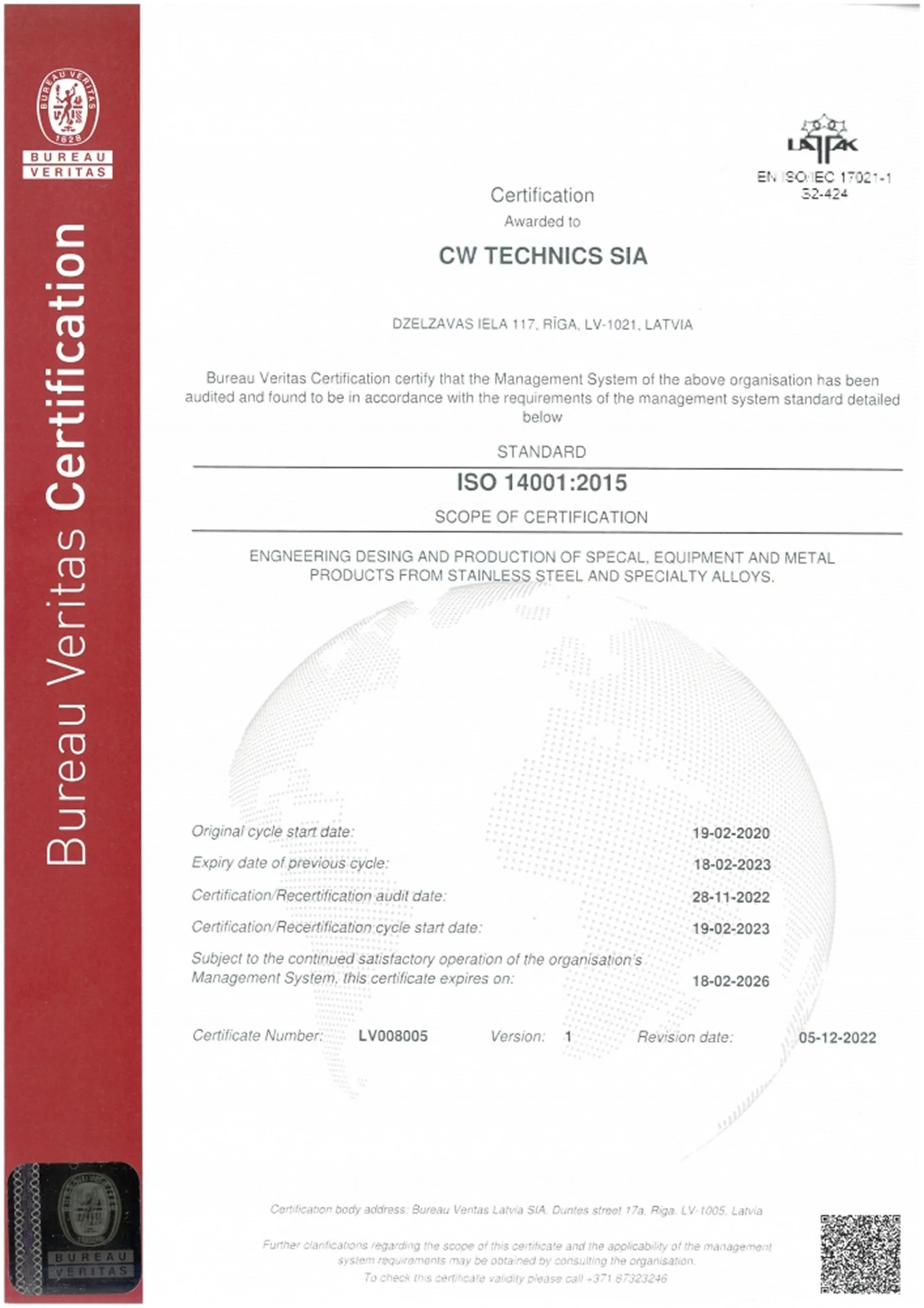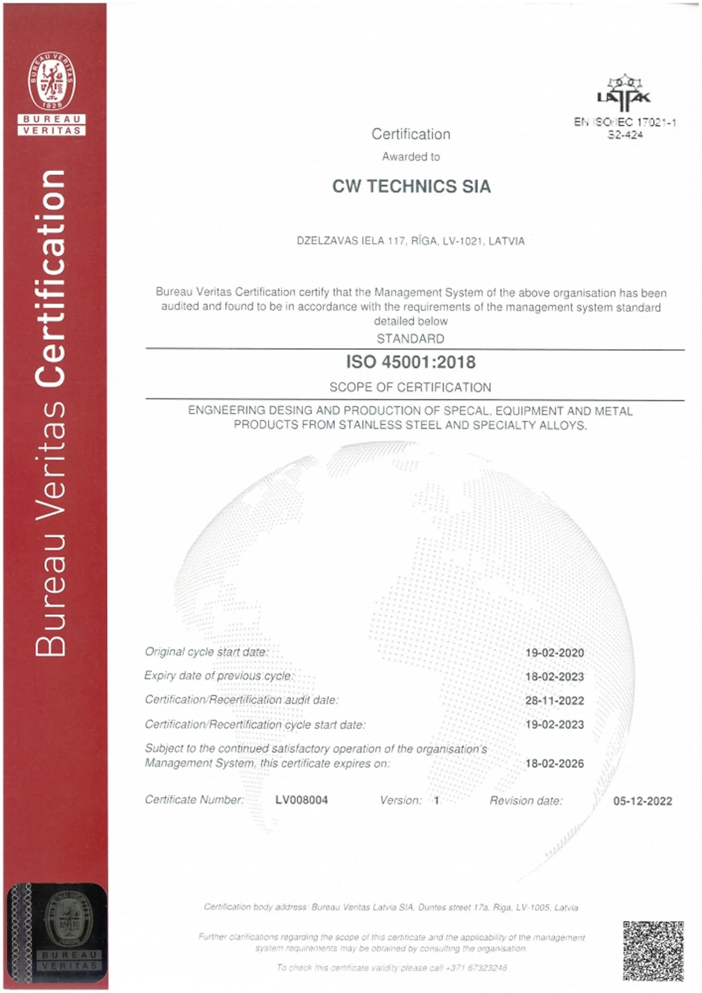 Область применения сертификата: Инженерное проектирование и производство специального оборудования и металлических изделий из нержавеющей стали и специальных металлических сплавов.
