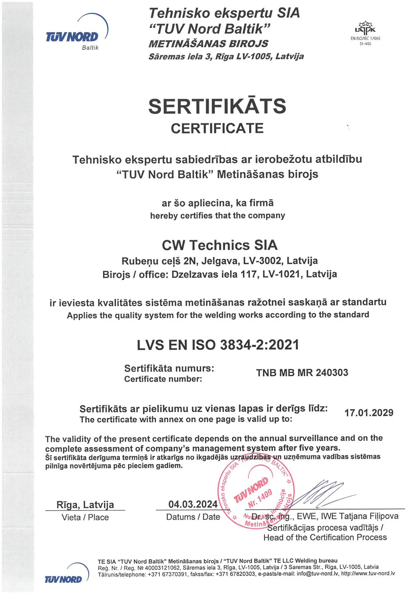 Область применения сертификата: Производство сварочных работ в соответствии с требованиями к качеству EN ISO 3834-2:2006.